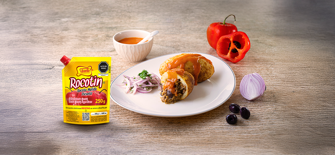 Servir cada Papa Rellena bañada con Rocotín Sibarita al gusto.